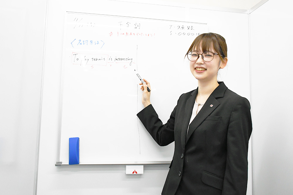 入社するまで指導経験が一切なかったので、上手に授業ができるのか不安でいっぱいでした。しかし、入社してみると丁寧な研修があり、授業の仕方や板書の書き方などを詳しく教えてもらうことができました。新卒社員同士でペアになって行う模擬授業では、相手からフィードバックを受けたり、先輩社員からアドバイスをもらったりすることができ、何度かチャレンジするうちに自然と不安は解消されました。ただ、受験知識はまだまだ乏しく、今後の課題だと感じています。まずは自分が担当している生徒の志望校を中心に勉強し、関連する学校や似た傾向の学校に手を伸ばしていく、という方法で知識を増やすようにしています。 -